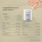 Kalsiyum Preparatı [Stabilizör (Tripotasyum Sitrat), Ortofosforik Asidin Kalsiyum Tuzları (Trikalsiyum Fosfat), Sitrik Asidin Kalsiyum Tuzları (Kalsiyum Sitrat), Stabilizör (Tripotasyum Fosfat)], Magnezyum Malat, Bitkisel Kapsül (Hidroksi Propil Metil Selüloz), Çinko Bisglisinat Şelat, L-Selenometionin Şelat, Bakır Bisglisinat Şelat, Sodyum Tetraborat Dekahidrat, Manganez Bisglisinat Şelat, Topaklanmayı Önleyici (Yağ Asitlerinin Magnezyum Tuzları, Silikon Dioksit), Krom Glisinat Şelat, Hacim Artırıcı (Mikrokristalin Selüloz), Vanadyum Bisglisinat Şelat, Potasyum İyodür, Sodyum Molibdat.